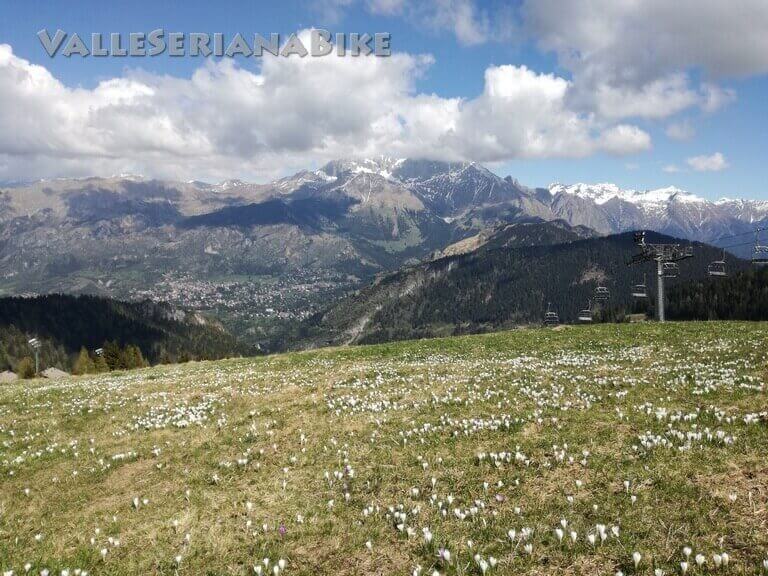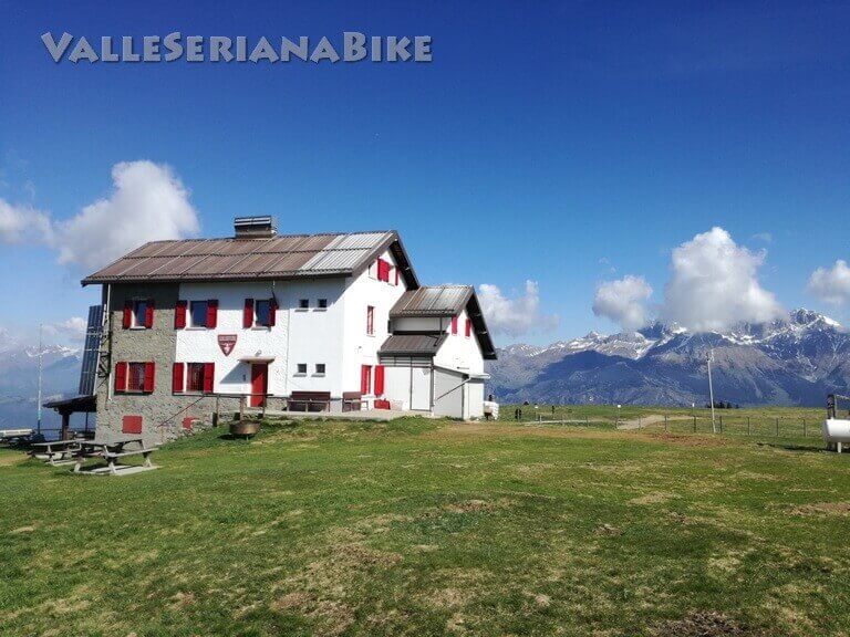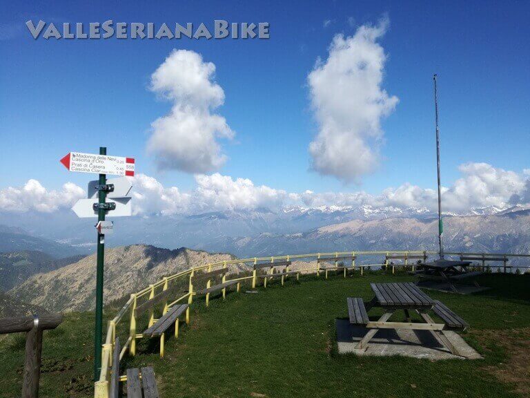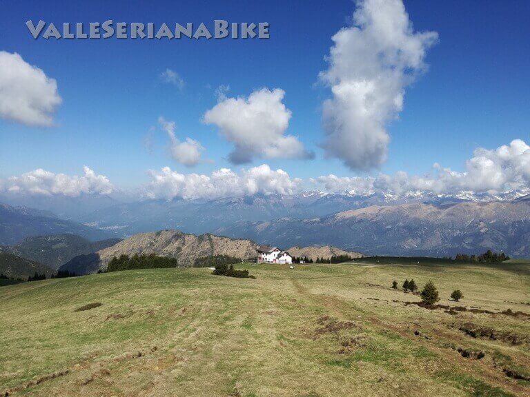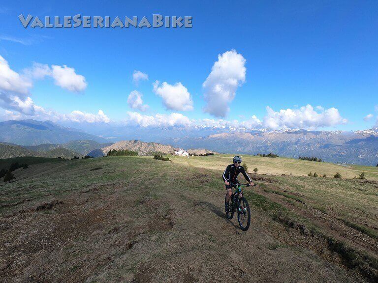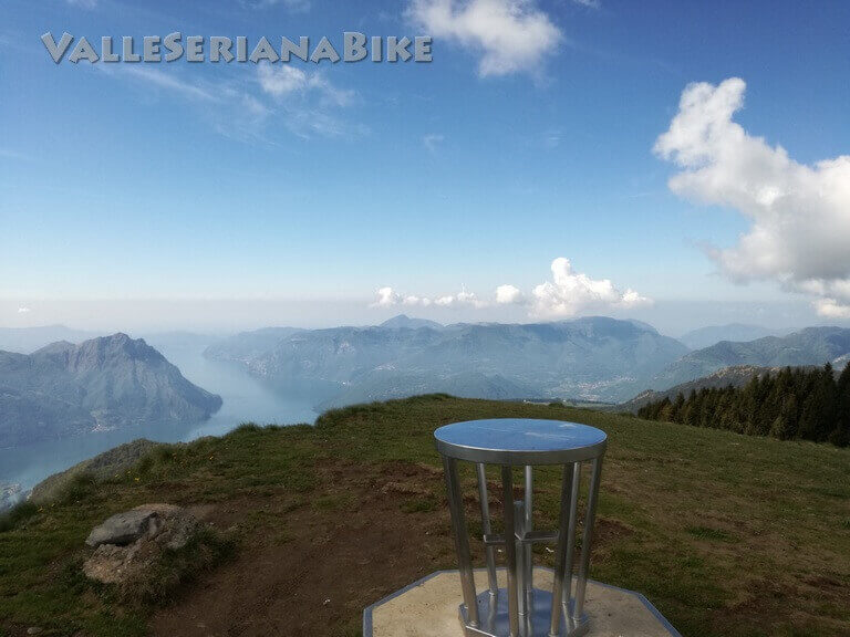 Ora possiamo decidere se fare una puntata al monte Alto e poi tornare al rifugio: Dal lato nord dello steccato che delimita il rifugio pedaliamo in salita seguendo il sentiero che ci porta alla cima a 1721 metri, da questo punto panoramico abbiamo modo di vedere una vastità di montagne a 360 gradi, il lago di Iseo, la Bassa Val Camonica e ovviamente “la Regina delle Orobie, la Presolana.